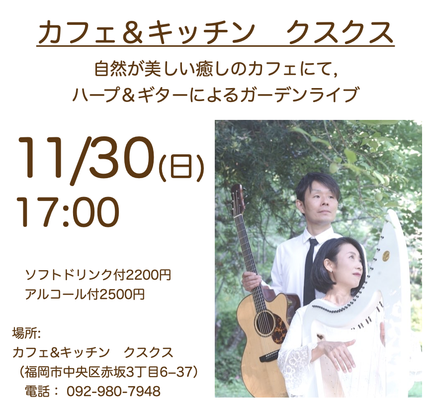 11月30日(日)17:00 cafe & kitchen KUSUKUSUガーデンライブ(福岡市中央区)