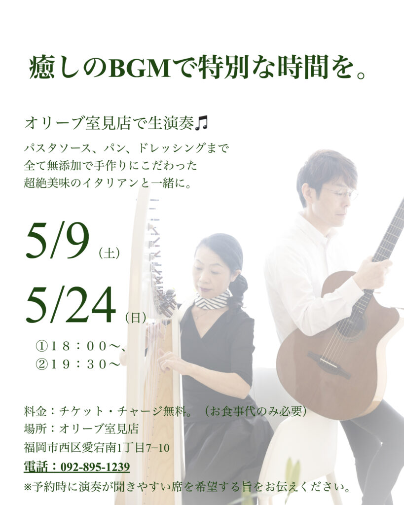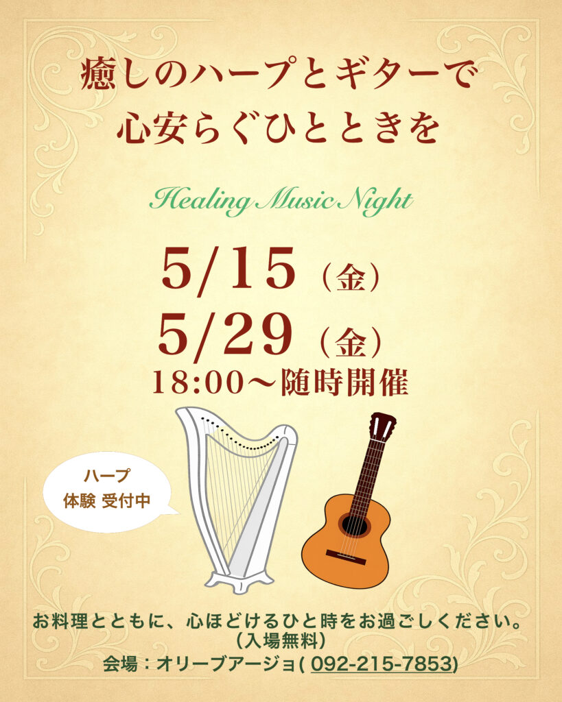 18:00〜22:30の間で、随時ハープ&ギター演奏